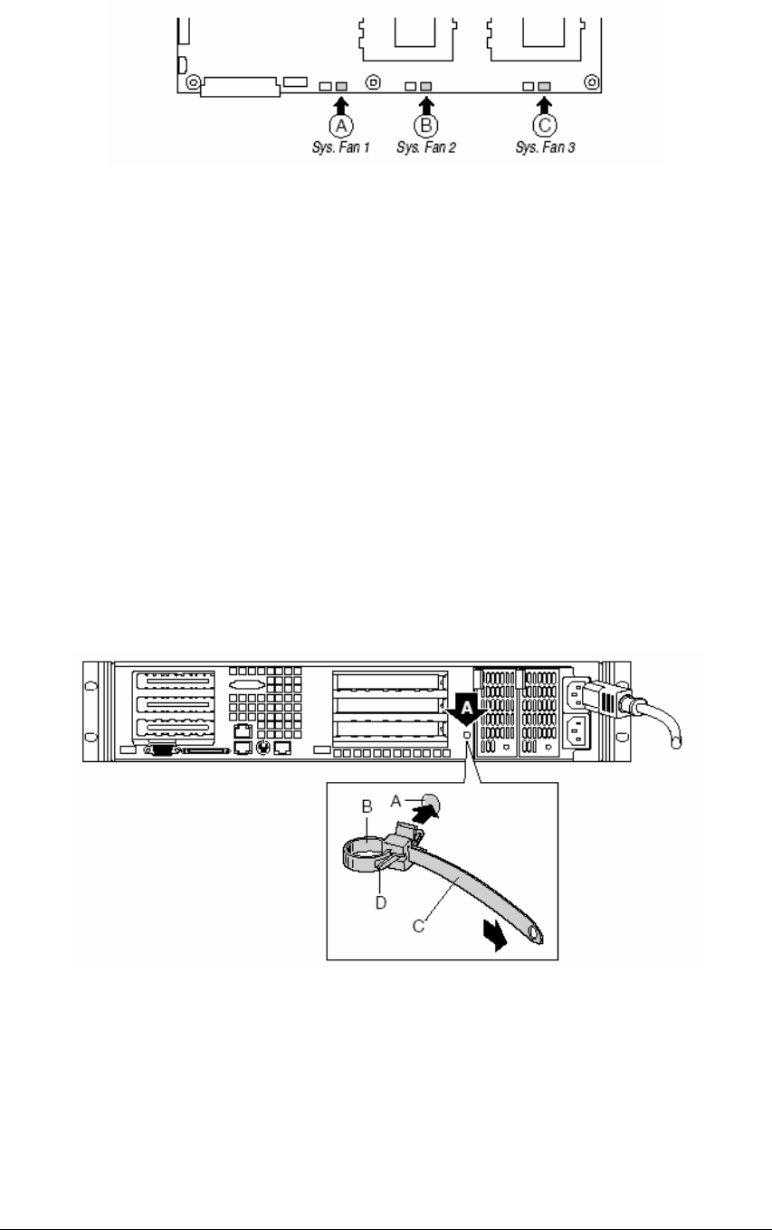 3. Insert the power cord into the plastic loop (B) of the strain relief.